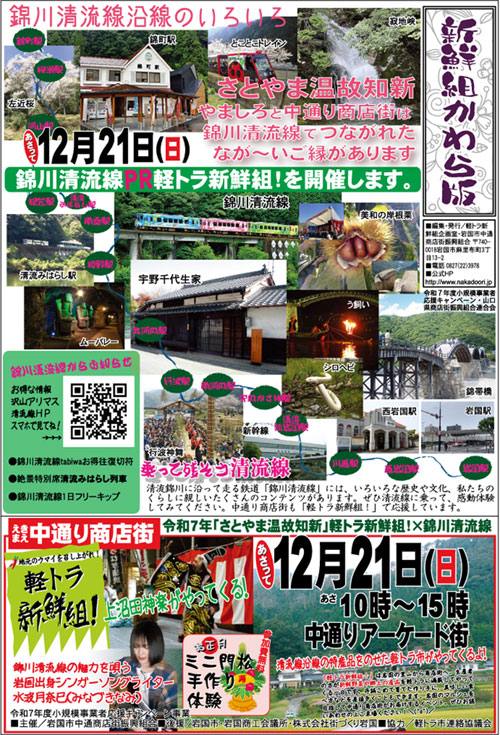 錦川清流線PR軽トラ新鮮組! 年の瀬も迫った21日(日)、錦川清流線×軽トラ新鮮組!を開催しました。 長〜いご縁をもつ中通り商店街と里山な美しい景色が続く錦川清流線で繋がっています。錦川清流線の活用をPRする軽トラ新鮮組!では、やましろは上沼田神楽、清流線の歌を唄う水波月奈巳さんのミニライブも開催。門松つくりの無料体験会など、賑やかな一日を楽しみました。