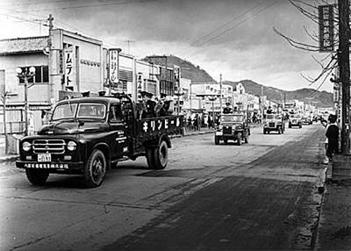 現在の本通り商店街、国道188号。靴店のムラトや、まつい旅館、パチンコ(ふみや)など、現在の駅前でも馴染み深い店名が見られます。道路を走るトラックもキリンビールのロゴと、バンパーには八百新の名前も。現在の福屋岩国店さん辺りから、ロータリー方向を見た図と思われます。