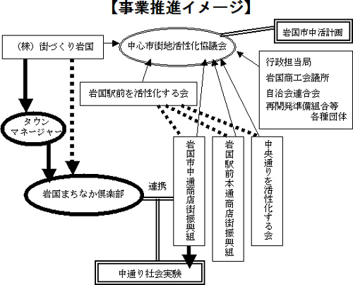 岩国市では平成25年10月に内閣府によって中心市街地活性化基本計画の認定を受けた。これに伴い中活計画を推進するために平成27年4月にタウンマネージャーを公募によって選任し、同年6月、株式会社街づくり岩国が中通り商店街の路面店舗へ「岩国まちなか倶楽部」の開設した。 本所は@岩国の特産品販売を行うアンテナショップ機能のほか、A街なか出店サポートセンターとしての機能や情報を備えることを柱に、B街なかにおけるコミュニティ空間の運営を行い、街づくりの実際的な拠点として機能している。 こうした背景を受けて当振興組合では、「岩国まちなか倶楽部」やタウンマネージャーらと連携し、商店街の経営革新に資する事業設計・調査に着手し、同時に中心市街地活性化基本計画の推進に効率的な役割を果たす事業を展開した。 本事業の実施によって得られた結果や課題は速やかにタウンマネージャーへフィードバックし、街づくりの推進に貢献しているか、また商店街の新たな形のコミュニティ効果が得られているかなど、データを蓄積しながら検証した。 本事業において一定の効果的が認められた事業は、「岩国まちなか倶楽部」が引き継ぎ、いずれは中活協に対して中心市街地活性化基本計画へ追加事業の提案を行う。