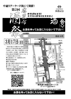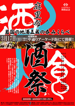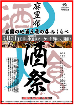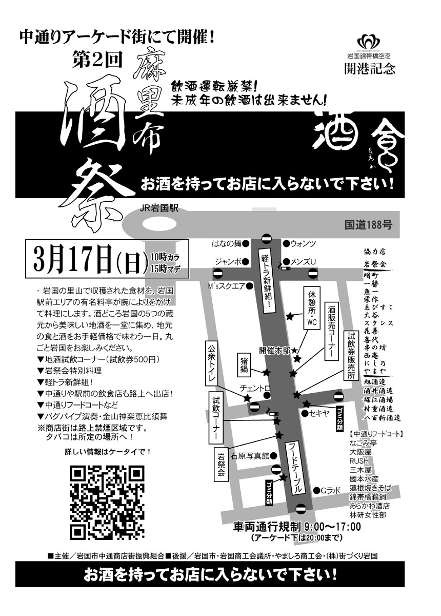 1)銘酒試飲コーナー 市内5つの酒蔵が造る銘酒を試飲できるコーナー。試飲券1〜2枚につき4〜5勺の清酒を味わっていただけます。会場で【5回分1冊=500円】の試飲券を販売いたします。 2)銘酒販売コーナー 市内5つの酒蔵が造る銘酒を販売いたします。ご自宅で、また贈答などにも大人気。岩国の美酒をお楽しみください! 3)有名料亭が地元食材で総菜を造って販売します