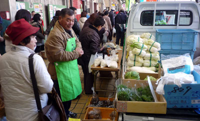 ほとんど手作りのPR道具を宛い、午前十時に幕を開けた。道行く人の表情をみると、まず「なんで軽トラがホコ天に停めてあるのか」と訝る様子があった。売り手である農家の人は掛け声も小さい。商売人が駆け寄り、威勢の良い声をかけると、少しずつ人だかりが生まれた。足を留めたお客様は野菜を手に取り、生産者と言葉を交わす。「親指ぐらいに切ってねえ、ちょっと醤油と塩をして二十分ぐらい煮るんよ」。調理法の伝授が始まっていた。
