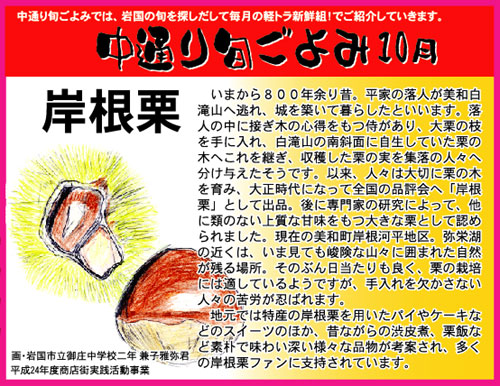 地元では特産の岸根栗を用いたパイやケーキなどのスイーツのほか、昔ながらの渋皮煮、栗飯など、素朴で味わい深い様々な品物が考案され、多くの岸根栗ファンに支持されています。