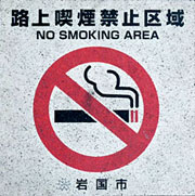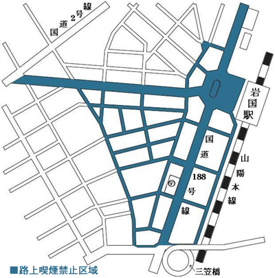 岩国市では2010年7月に「岩国市良好な生活環境確保のための迷惑行為防止に関する条例」を施行しました。これに伴い市内の3区域(駅前エリア・錦帯橋エリア・市庁舎エリア)で路上喫煙禁止区域が指定されました。区域内では所定の喫煙場所以外で喫煙ができません。