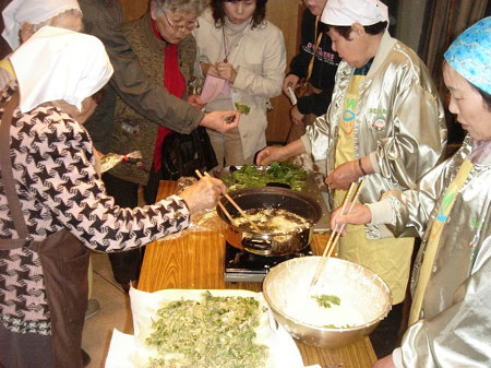 ▼商店街の中程にある特設店舗では、やましろから「錦清流グループ」が参戦。春の山菜を持ち込み、てんぷら料理の試食販売を行いました。