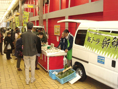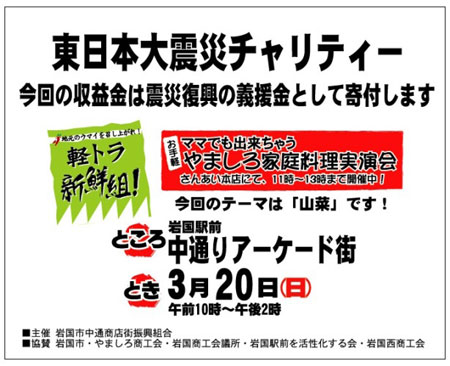 ▼「軽トラ新鮮組!」の準備をしていた3月11日に東日本大震災が発生しました。甚大な被害を目の当たりにした実行委員会では、イベントを自粛することも議論されましたが、「いま働けるのは西日本の我らだ」と満場一致。直ちに『震災復興チャリティーイベント』として企画内容を変更し、実施に至りました。