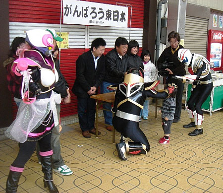 ▼開催直前のある日、岩国ヒーロー委員会から募金活動の協力をお申し入れ頂きました。地元の子どもたちに大人気のご当地ヒーロー「ハクジャオー」が一緒に街頭募金をしてくださる事になりました。急仕立てのイベントだったにもかかわらず、とてもスムースなイベント運営ができたことに、商店街では改めて感謝しています。この日「ハクジャオー募金」でお寄せいただいた金額は12万円余りに上りました。