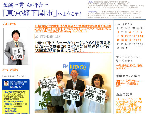 北九州小倉をキーステーションにFMキタキュー、ユーストリーム、サイマルラジオを通じて全世界に向けて発信される、”「知ってる? シューカツ」〜【はたらく】を考えるLIVEトーク番組”題して「商店街って何だ?」に、藤田副理事長が生出演。鬼才シャッフル北尾さんを始め、大学生のみなさんと一緒に商店街について語り合いました。