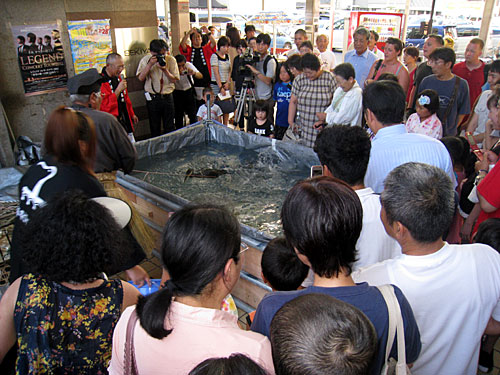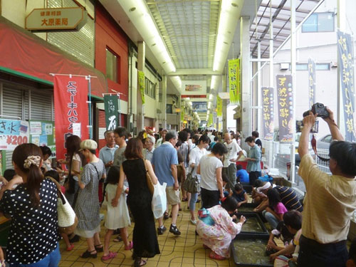 中通り商店街では4年前から、岩国の観光を代表する「鵜飼い」をテーマに錦帯橋鵜飼株式会社と協力し、「鵜飼い実演」や「鮎のつかみ取り」を取り入れています。