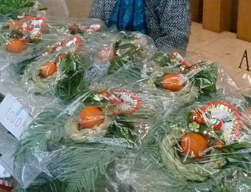 昨夜までの雨も上がり、比較的あたたかい朝に始まった12月の軽トラ新鮮組!でした。今回は久しぶりの「勘場猪鍋」に加えて、市内四蔵の地酒も販売。林研女性部会の方々は注連飾りやツル飾りを持ち込まれ、軽トラは今期最多の21台が集結し、おおぜいの人出で賑わいました。