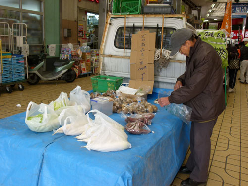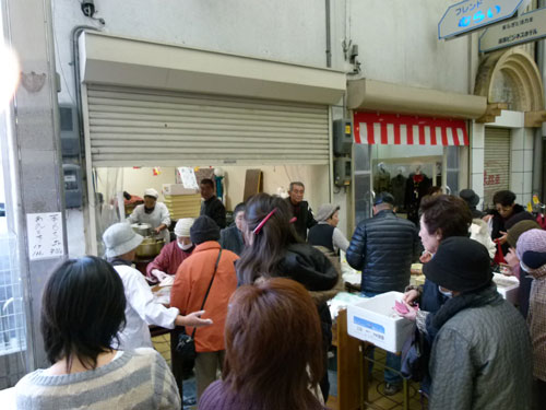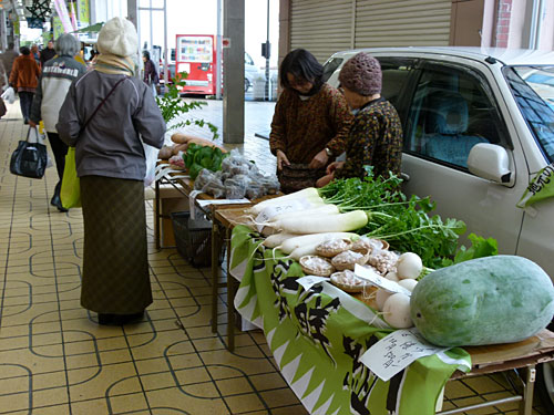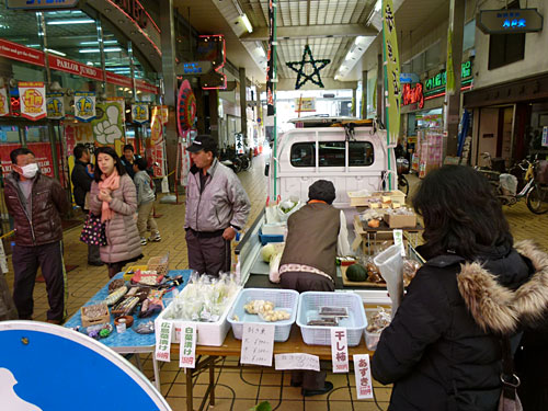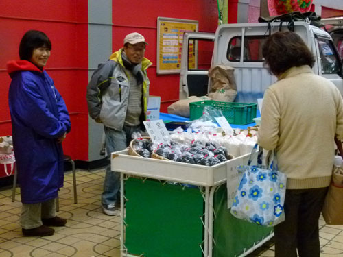 同時開催の「中通り旬ごよみ」では、あと2週間余りに押し迫った年の瀬を控え、「岩国の田舎正月」をテーマに様々な品物を集めて販売しました。やっぱり軽トラ新鮮組!に猪鍋はよく似合いますね。\(^o^)/