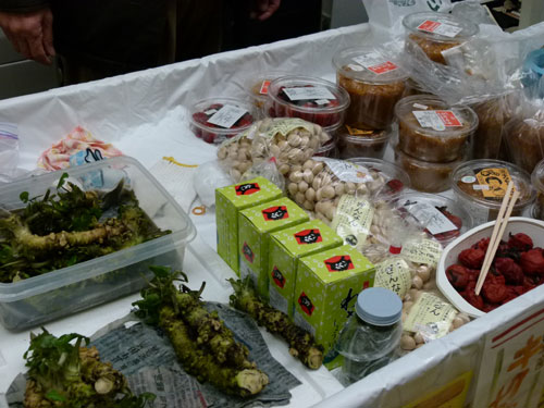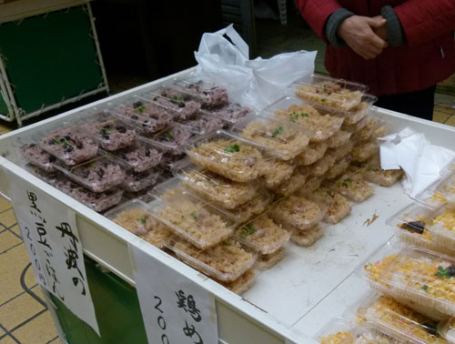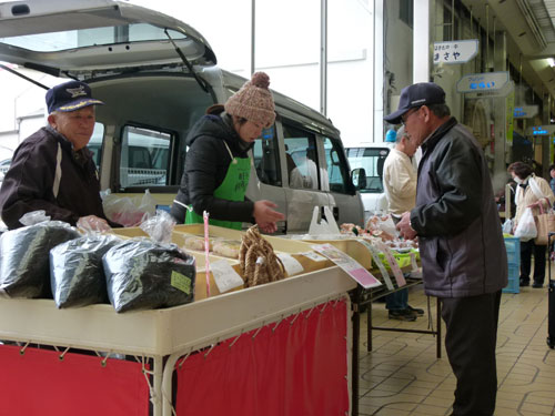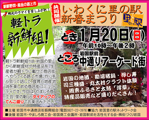 今月の軽トラ新鮮組!は、やましろ商工会が取り組んできた「旅の五街道」事業、いわくに里の駅完成記念イベント”新春まつり”と共同開催となりました。いつもの軽トラ市の他、里の駅として認定された岩国各地の拠点から、様々な出品がありました。地酒コーナー、木琴作製体験、押し寿司三種盛りなど、地域の特産品がてんこ盛り。