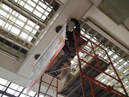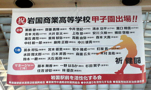 商店街のアーケードへ、選手の健闘を祈念する垂れ幕を設置しました。