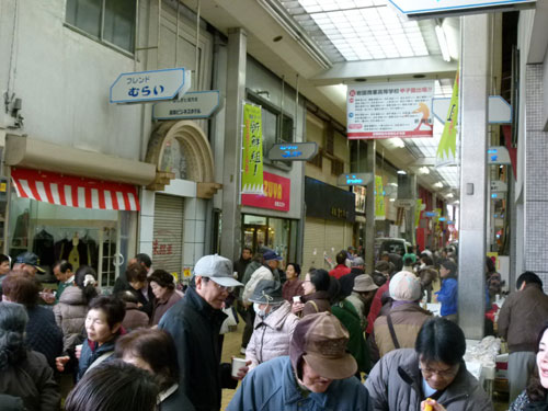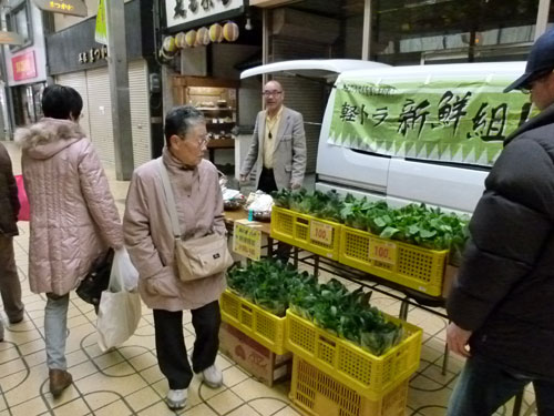 放射冷却で冷え込んだ2月17日の午前9時。ぞくぞくと軽トラ新鮮組!が集まってきました。午前10時にはスタンバイ完了。総勢19台の軽トラが商店街アーケードにずらりと勢揃い。
