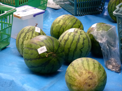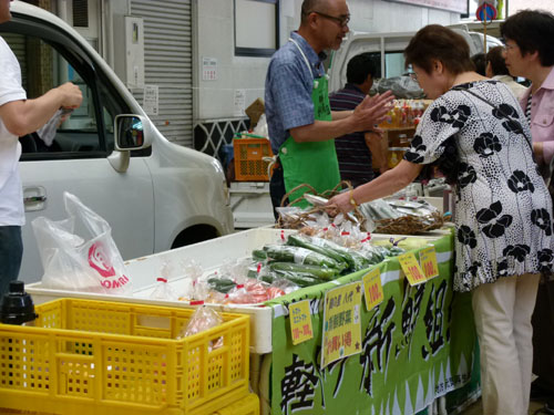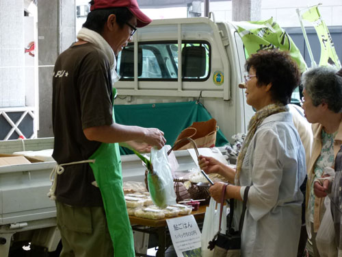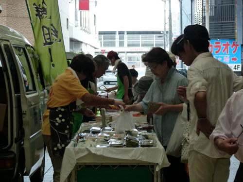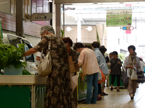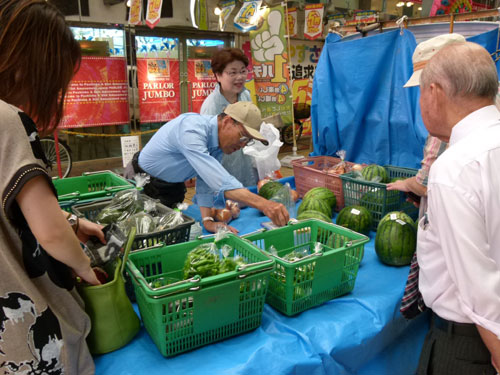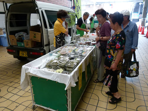 高気温が続く真夏の軽トラ市は、露地物野菜も少なくなるシーズンですが、畑から朝採り食材を運び込んでくださいました。