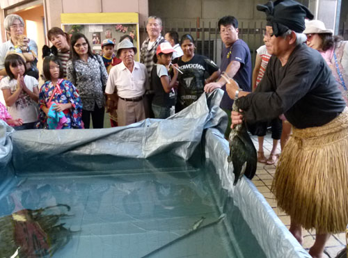 当日は鵜匠頭の村中鵜匠に来ていただき、商店街の特設水槽で鵜飼いの実演を披露していただきました。間近で見る鵜飼いのテクニックには、観客のみなさんも大興奮。元気の良い鵜との絶妙なコンビネーションで、鮎を捕まえていました。