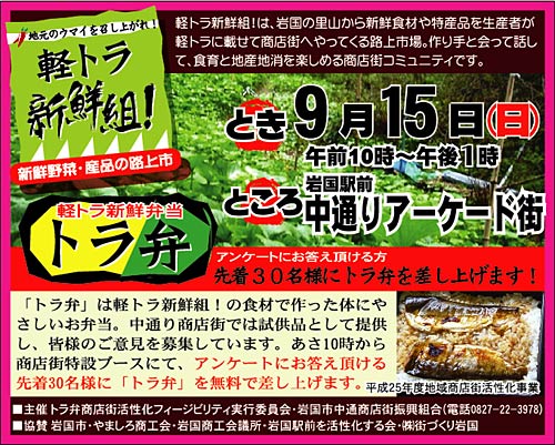 今月から、平成25年度事業「トラ弁商店街活性化フィージビリティ」がスタート。軽トラ新鮮組!の食材で作ったお弁当の試作品をモニターして頂き、次年度の計画に活かします。
