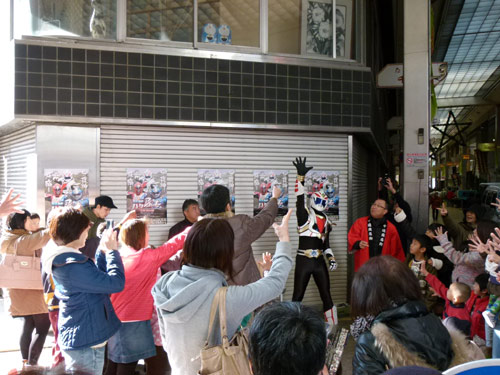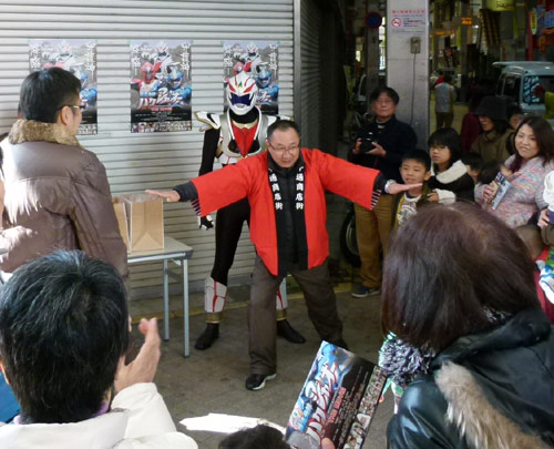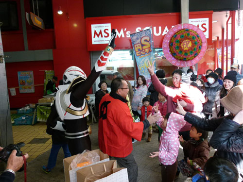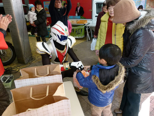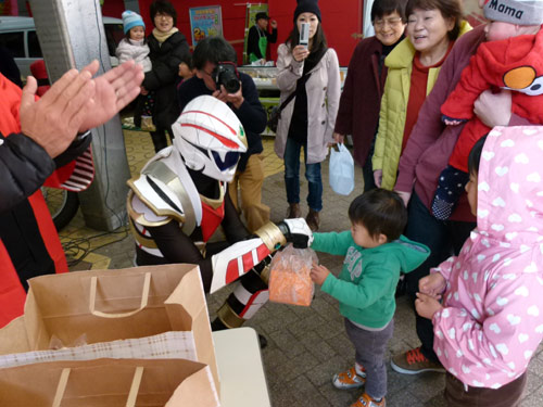 そんな中でハクジャオーのジャンケン大会がヒートアップ。勝ち抜いた5人のちびっこに、ハクジャオーと商店街からクリスマスケーキが進呈されました。