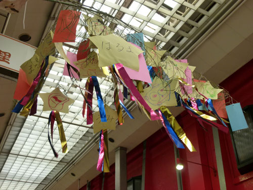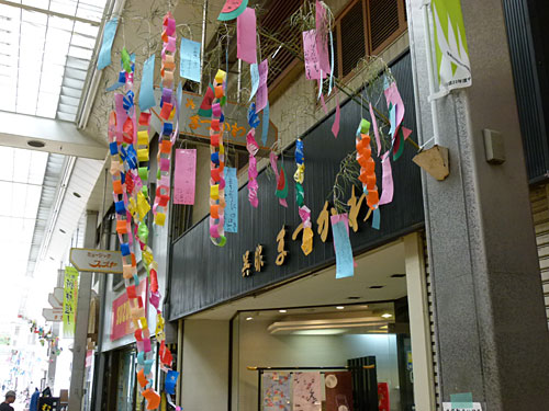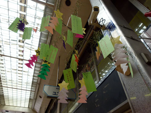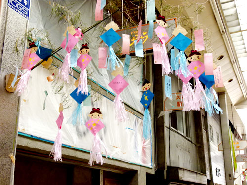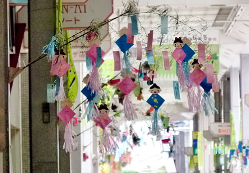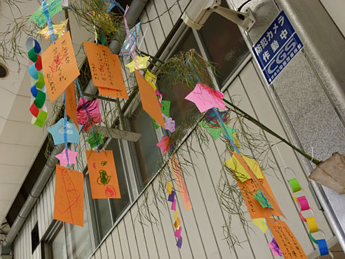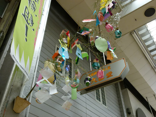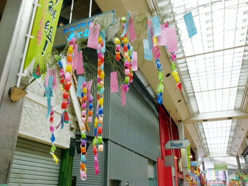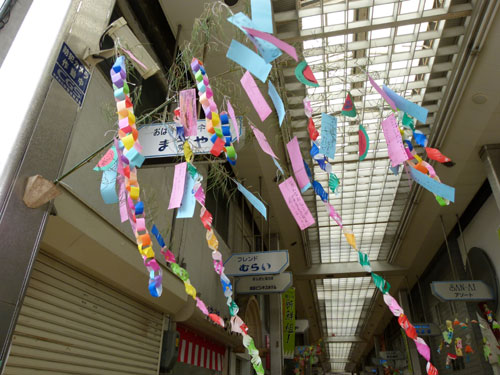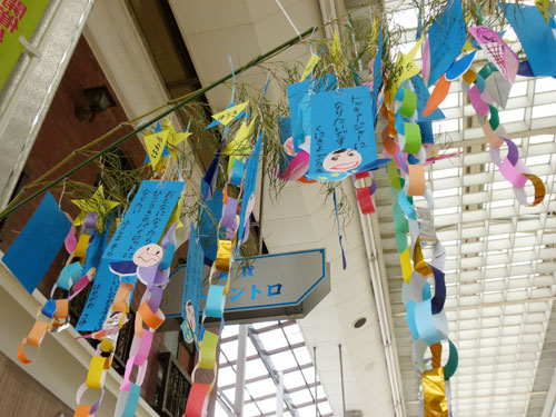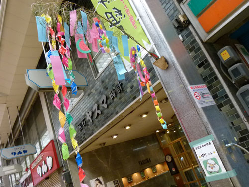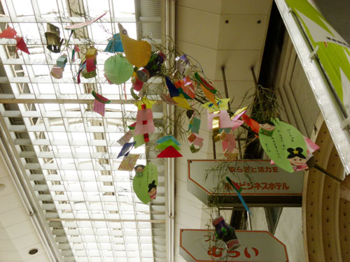 中通り商店街では、アーケードの柱へ笹飾りを設置しました。