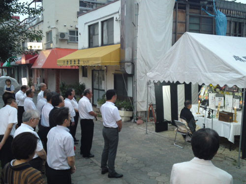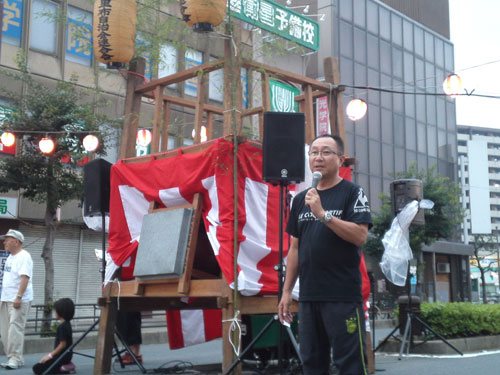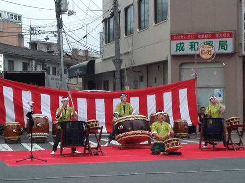 午後5時、オープニングを飾る迫力の太鼓演奏で祭の幕が上がりました。続いて主催の岩国駅前を活性化する会の会長、松川卓司氏(中通り商店街理事長)が挨拶。戦没者の慰霊に加え、駅前の発展を願う言葉で締めくくりました。神事では福田良彦岩国市長をはじめ、政界や自治会など関係当局の代表が参集されました。