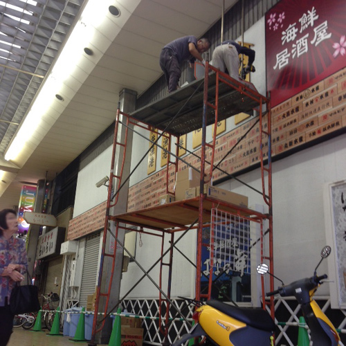 中通り商店街のアーケード照明は、時間と明るさに応じて点灯パターンが設定してあります。夜間から早朝未明にかけては防犯灯として点灯させており、蛍光管の劣化は地域の安全・安心にもかかわる事。このたび劣化した蛍光管の交換を行いました。どうぞ安心して中通り商店街をお使いください。