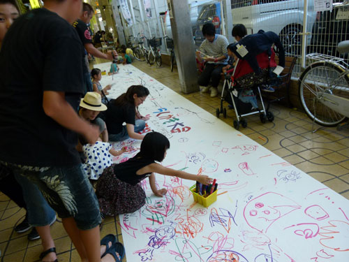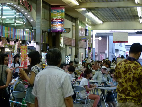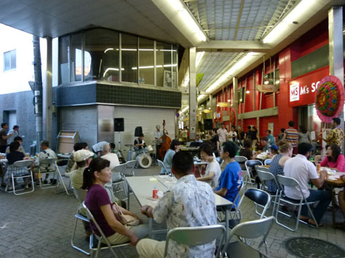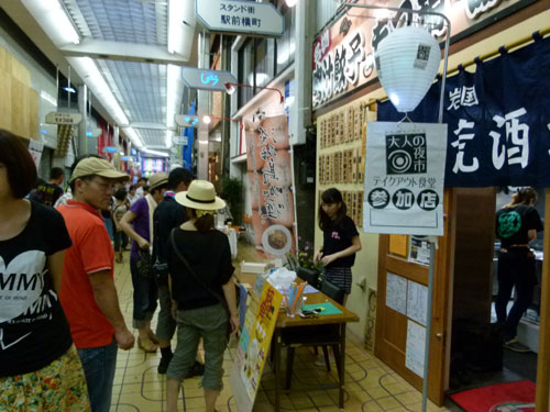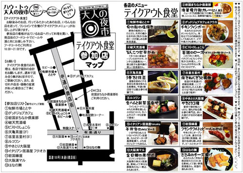 「酒と食と音楽で楽しむ駅前の一夜」と題して開催した夜市です。中通り商店街のアーケード空間をフードコートに仕立て、周辺に最近開業した人気・話題の飲食店の協力で、テイクアウト型バルの形で飲食店にワンコインで買えるお持ち帰り品を販売していただく仕組み。今年はメニューシートも作り、どんなお店にどんな美味しい物があるのかをお知らせしました。大好評!
