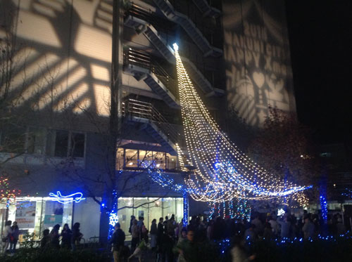 駅前本通り商店街に面したYMCAをお借りして、イルミネーション点灯式を開催しました。