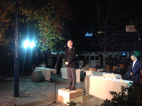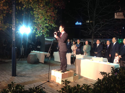 岩国駅前を活性化する会の松川会長の挨拶で開会。ご来賓の方々が点灯スイッチをオン。