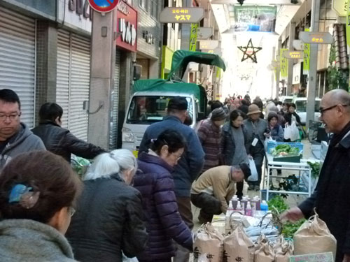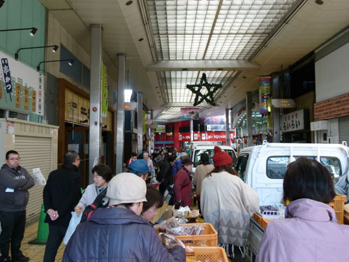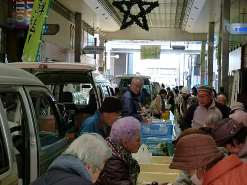 毎年12月開催の軽トラ新鮮組!は、大勢のお客さまと沢山の軽トラで大賑わいとなります。今回も今年最多の総勢20台の軽トラが、商店街の端のほうまで並びました。
