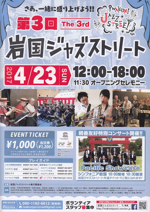 今年で3回目となる岩国ジャズストリートが開催されました。年々に拡大するイベントは今年、40組ほどのジャズメンが岩国へ集い、中通り商店街の路上やメインステージ、周辺のライブハウスを心を揺さぶるジャズの音色で充たしました。