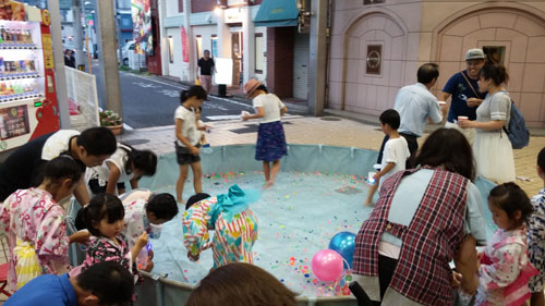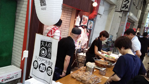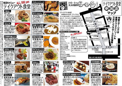 「酒と食と音楽で楽しむ駅前の一夜」と題して開催した夜市です。中通り商店街のアーケード空間をフードコートに仕立て、周辺に最近開業した人気・話題の飲食店の協力で、テイクアウト型バルの形で飲食店にワンコインで買えるお持ち帰り品を販売していただく仕組み。今年もメニューシートを作り、どんなお店にどんな美味しい物があるのかをお知らせしました。大好評!