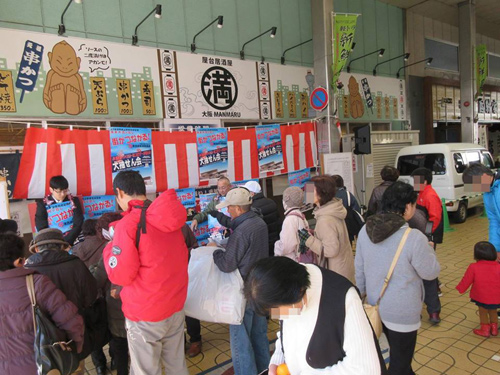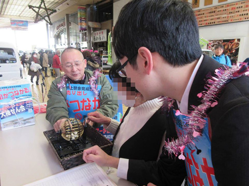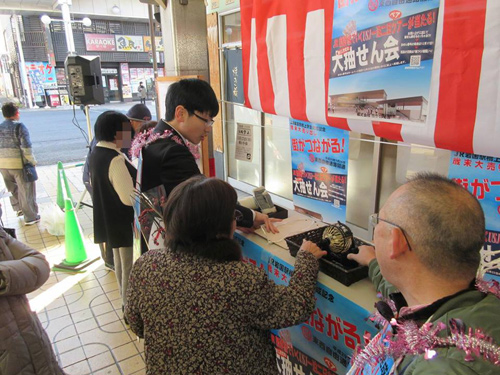 12月17日の軽トラ新鮮組!の中へサンドイッチマンが登場。宝くじの当選番号を決めるイベントを開催しました。