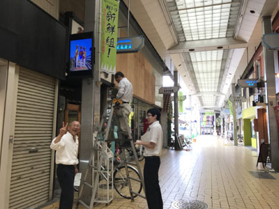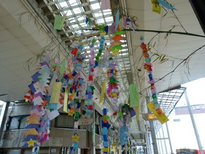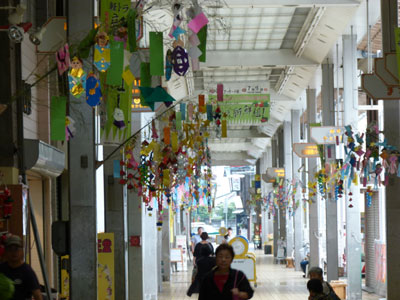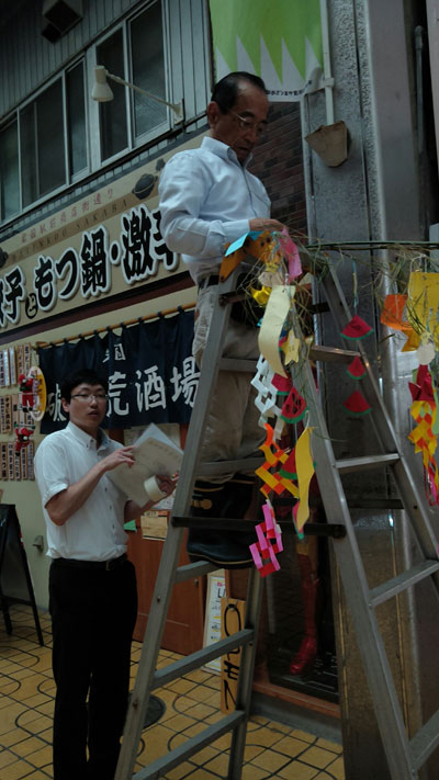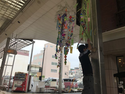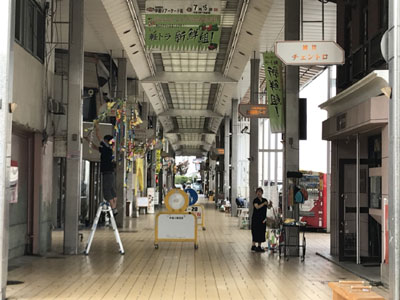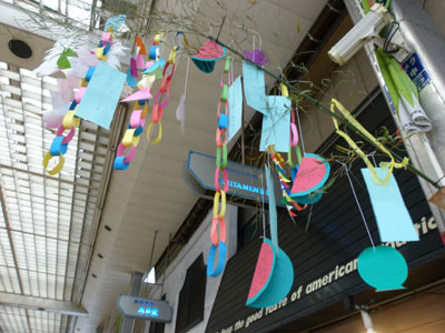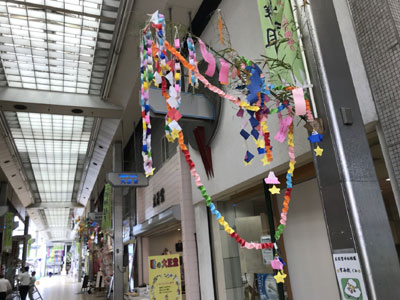 中通り商店街では、アーケードの柱へ笹飾りを設置しました。