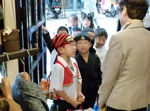 ジャックランタンを提げたお店をたずね、たくさんのお菓子を袋一杯にして満面の笑顔。