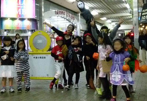 毎年恒例、英会話教室のちびっこたちがハロウィンパーティを開催され、仮装したファミリーが中通り商店街にやってきました。