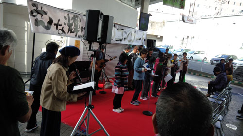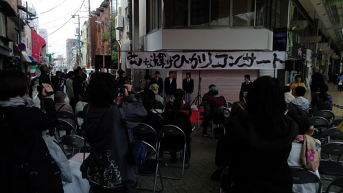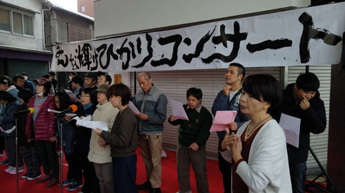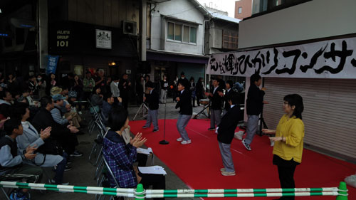 ひかりコンサートは軽トラ新鮮組!と同時開催。大勢のお客さんと演者さんで大賑わい。子どもも大人も一緒になって、楽しく歌って踊る姿と、景気の良い軽トラ新鮮組!のかけ声が商店街に響きました。