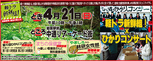 4月の軽トラ新鮮組!は「ひかりコンサート」と同時開催。看護協会による「まちの保健室」も同時開催。さらには林業研究グループ女性会の面々も里山の幸をもって特別参加。お天気もよく、いつもにも増して賑やかな一日になりました。