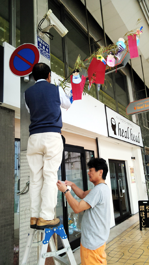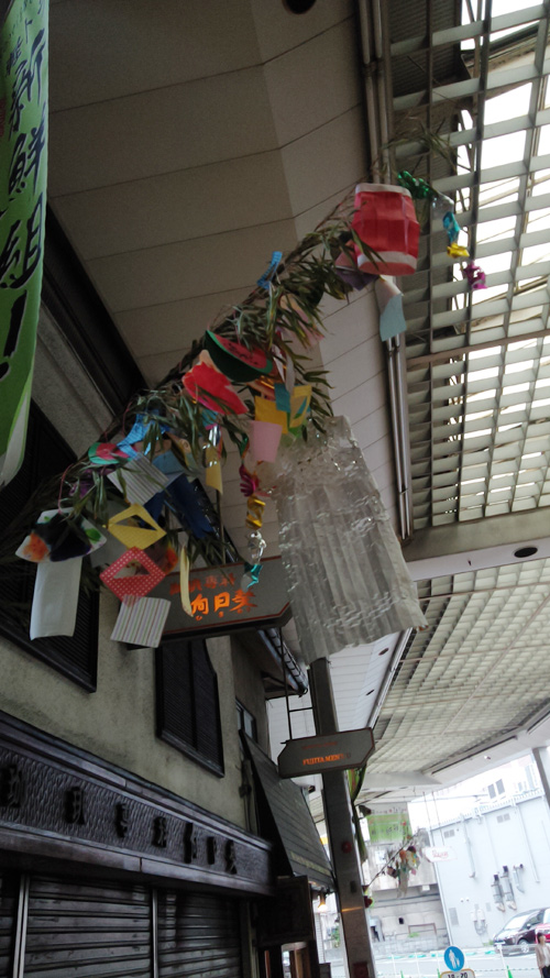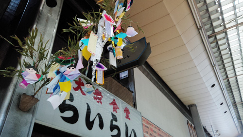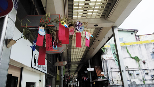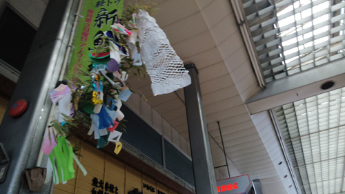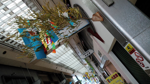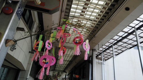 中通り商店街では、アーケードの柱へ笹飾りを設置しました。
