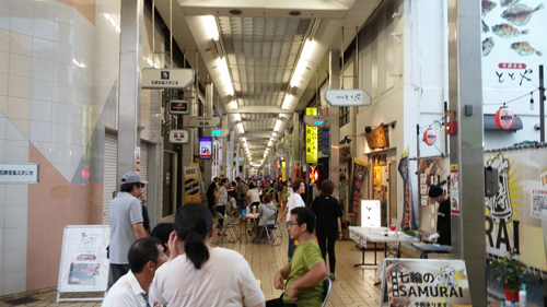 中通り商店街のアーケード空間をフードコートに仕立て、周辺に最近開業した人気・話題の飲食店の協力で、テイクアウト型バルの形で飲食店にワンコインで買えるお持ち帰り品を販売していただく仕組み。各テーブルにはメニューシートも用意して、どんなお店にどんな美味しい物があるのかをお知らせして大好評!
