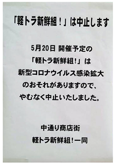 2020年5月20日(日)。「5月軽トラ新鮮組!」は中止いたしました。一日も早い平和な商店街になりますよう。