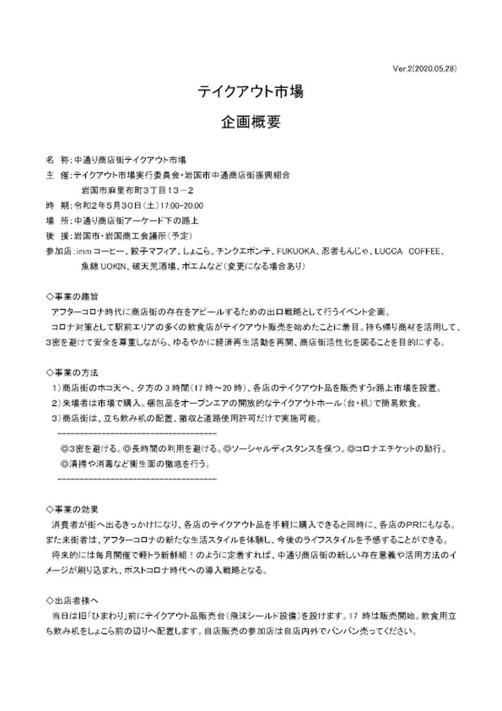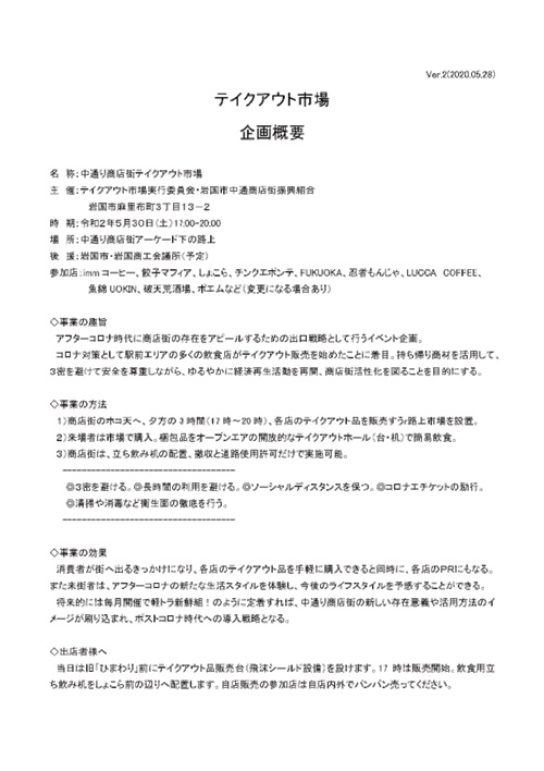 コロナ対策として駅前エリアの多くの飲食店がテイクアウト販売を始めたことに着目。持ち帰り商材を活用して、3密を避けて安全を尊重しながら、ゆるやかに経済再生活動を再開、商店街活性化を図ることを目的に開催しました。