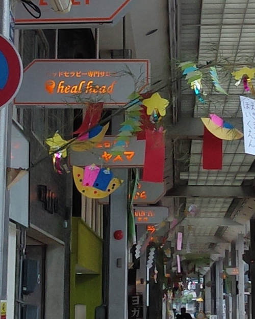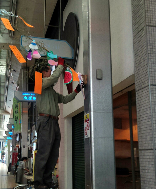 中通り商店街では、アーケードの柱へ笹飾りを設置しました。