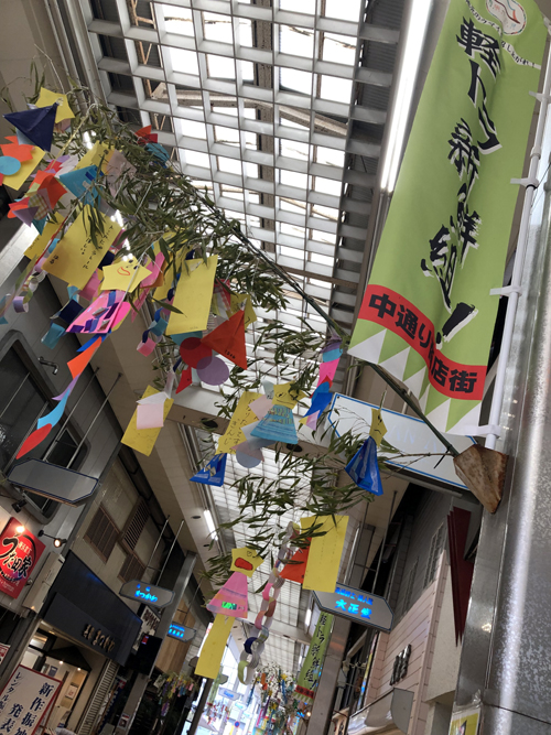 中通り商店街では、アーケードの柱へ笹飾りを設置しました。